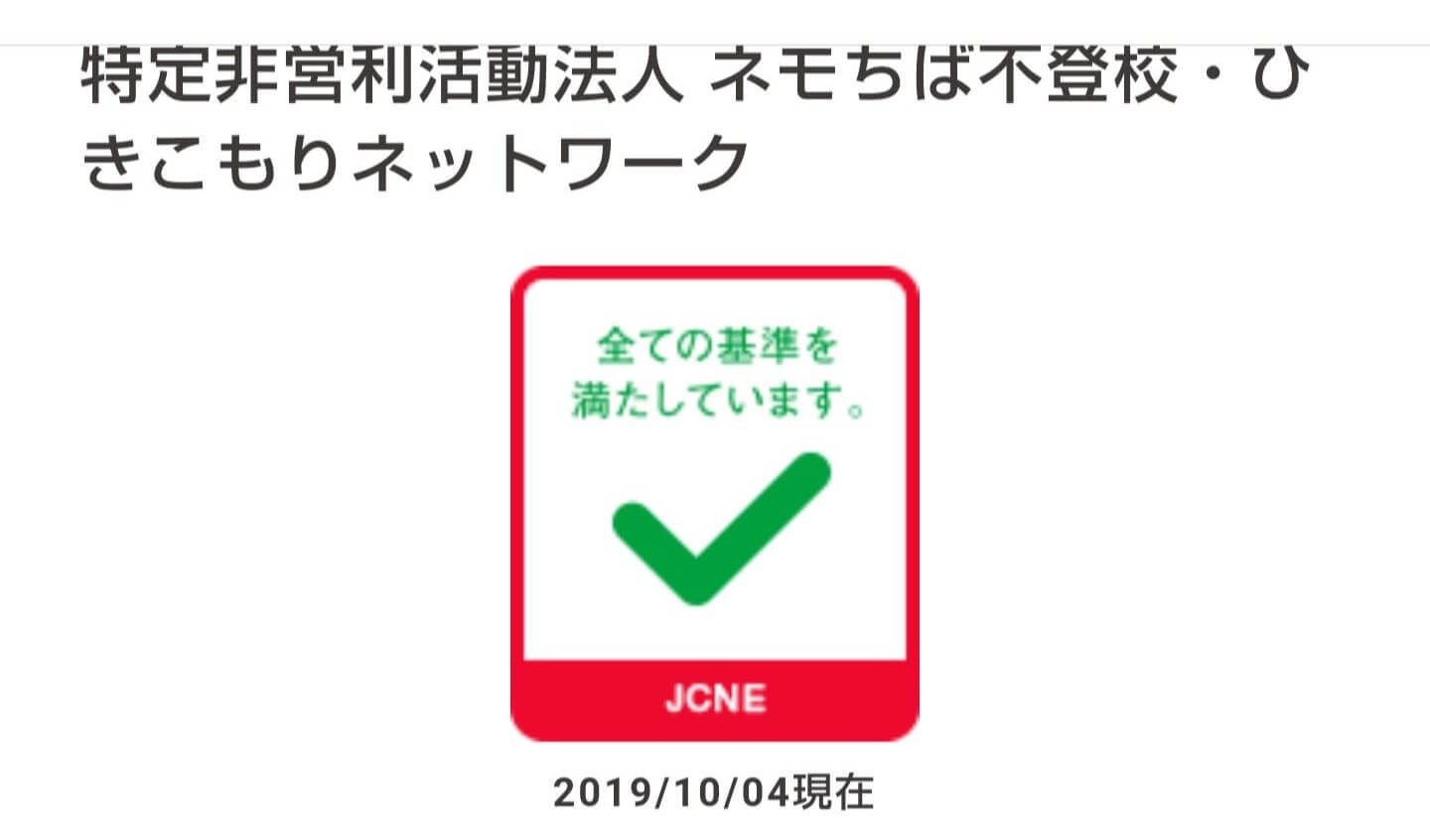 このたびネモネットは、非営利組織運営の第三者評価を行っている「一般社団法人 非営利組織評価センター(JCNE)」の審査を受け、すべての項目で基準を満たしているという評価をいただきました。