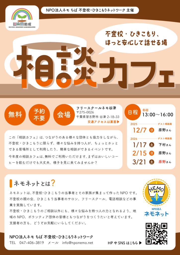 つながりのある様々な団体とも協力をしながら、不登校・ひきこもりに限らず、様々な悩みを持つ人が、ちょっとホッとできる居場所として利用したり、簡単な相談ができるイベントです。